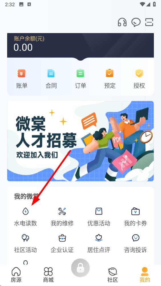 2、在进入的界面中,找到水电读数选项并点击,进入抄表记录查看页面。