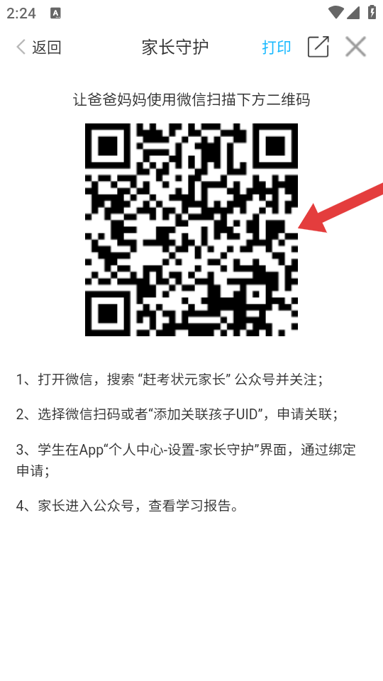 4、扫描家长守护页面中的二维码,按提示关注公众号并完成关联,即可进入家长模式。