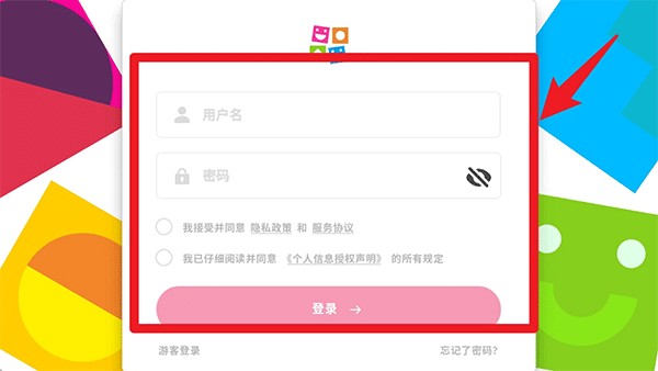 1、打开英孚教育App进入登录页面,输入用户名与密码并勾选协议条款,点击登录;