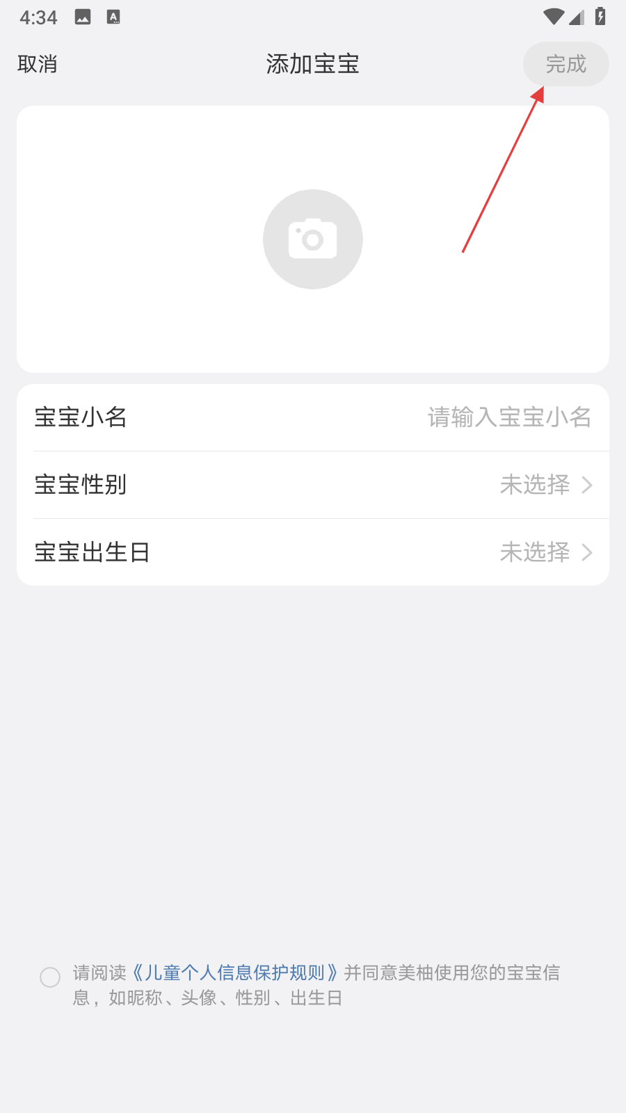 4、在添加宝宝信息页面,填写宝宝小名、选择宝宝性别、设置宝宝出生日,点击完成,即可添加宝宝。
