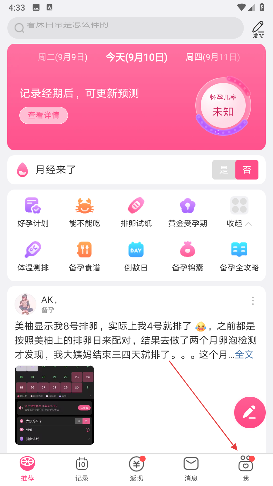 1、打开美柚APP,点击底部导航栏我,进入个人页面。