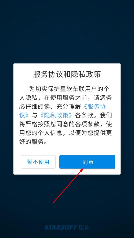 1、打开星软车联App,弹出“服务协议和隐私政策”提示框,仔细阅读后点击“同意”,进入到应用介绍页面。