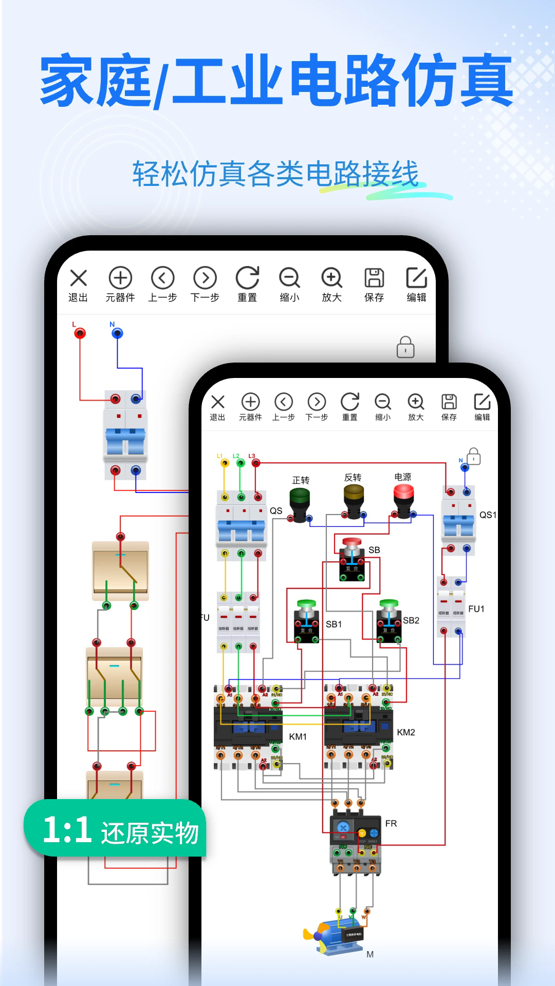 电工仿真是一款高效的电路仿真工具软件,用户在线就可以轻松学习,可以对各种电路一键仿真模拟,软件有详细的图文搭配,能够让你一比一的还原实物,在线就可以对实物元器件进行还原,软件还有社区广场,各位电路爱好者在线就可以交流,软件还有各种电工证理论题库,提供了线上的模拟接线,能够模拟真实的接线环境,提高电工技能。