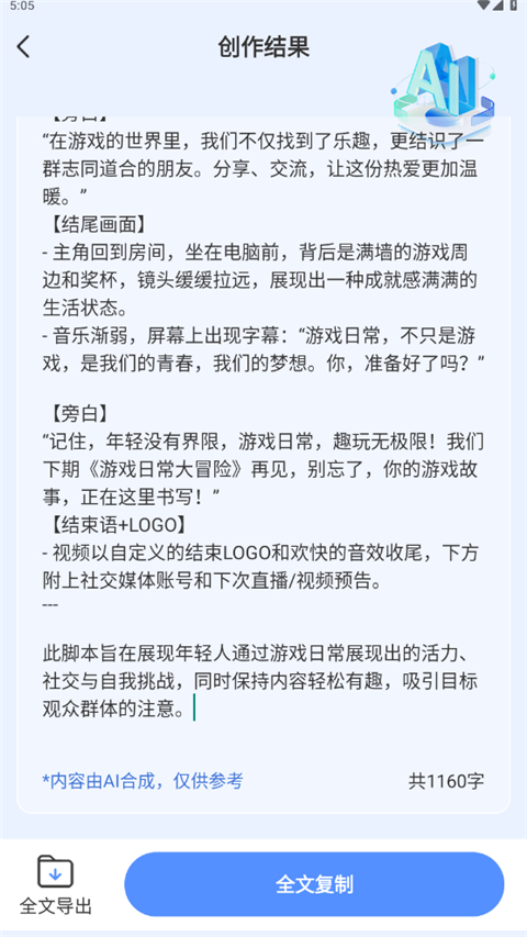 4、点击生成等待AI给出结果,支持全文导出、复制文本。