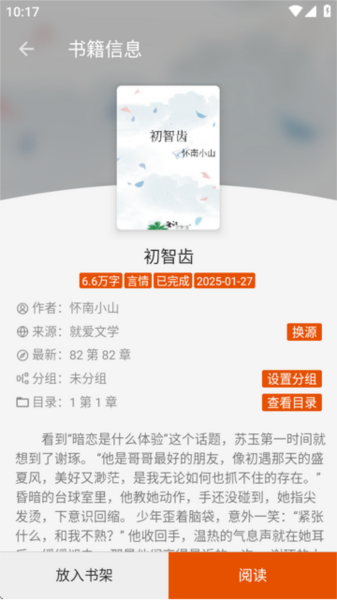 5、书架与记录:收藏小说至书架,按“已读、在读、想读”分组管理,自动记忆阅读位置,支持历史记录查询与续读。