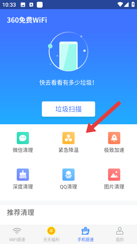 1、打开360免费WiFi,在手机提速页面点击紧急降温选项,进入紧急降温界面。