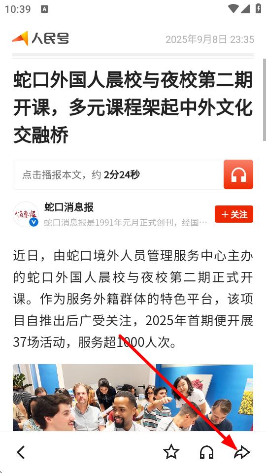 3、进入文章详情页后,点击页面右下角的分享图标。