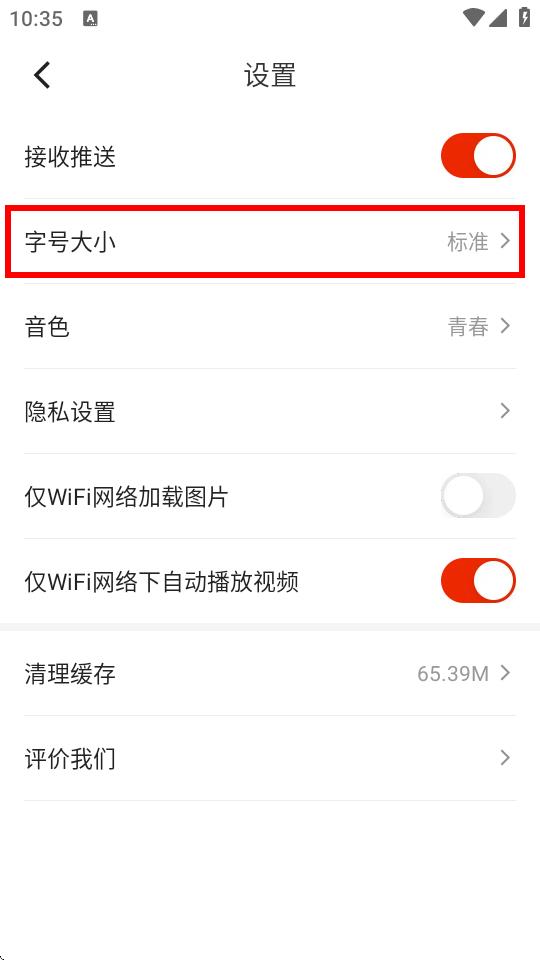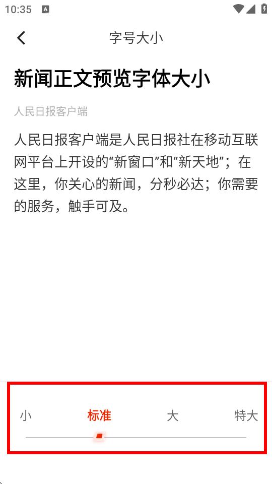 4、进入字号大小设置页面后,可以看到有小,标准,大,特大等选项,可将新闻正文预览字体调整为你需要的大小。