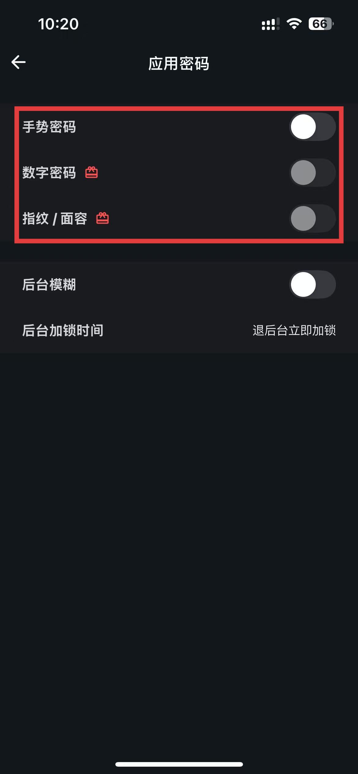 4、在应用密码设置界面,选择想要设置的密码方式,如手势密码、数字密码、指纹面容,点击对应选项的开关并按照提示完成密码设置。