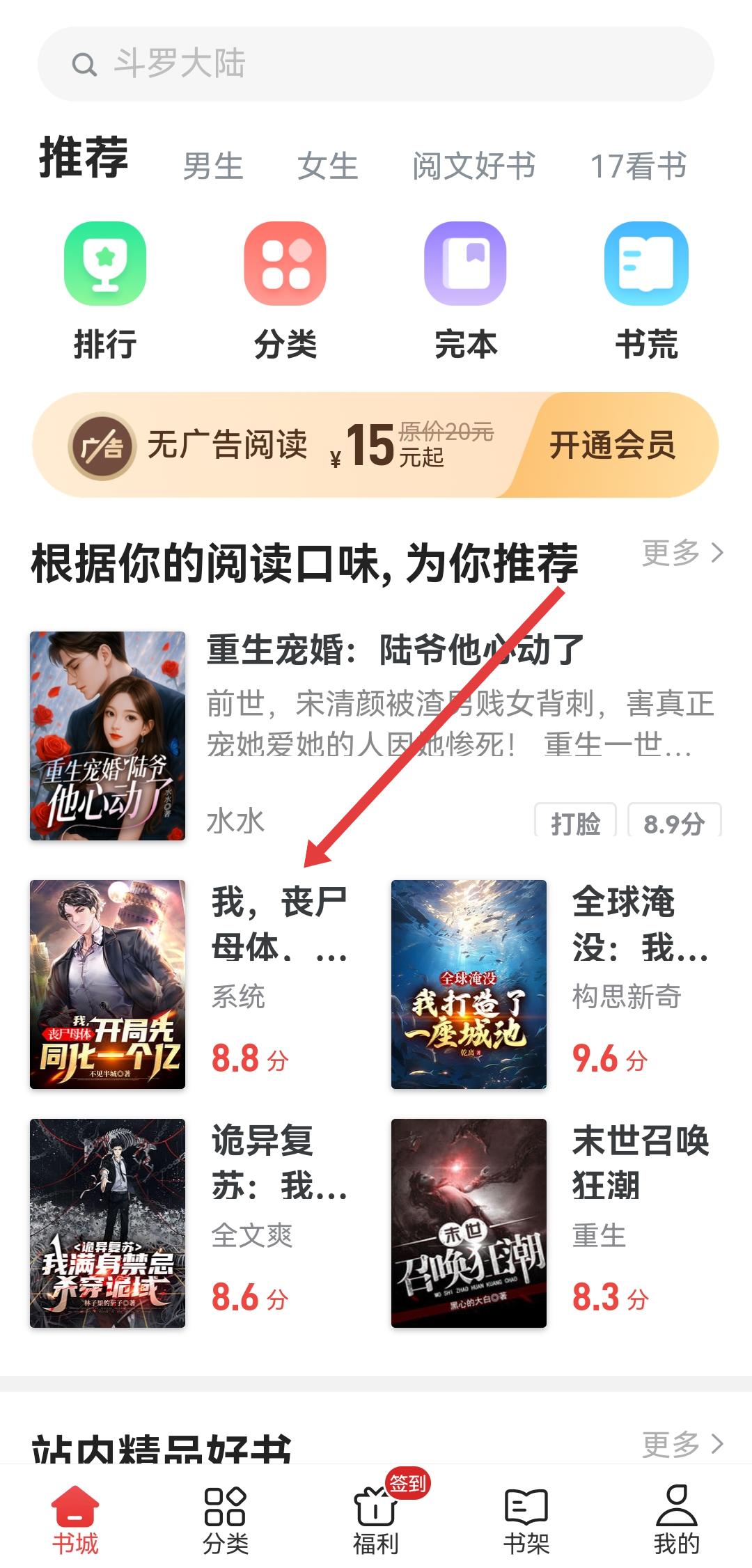 1、在追书神器书城页面,点击要分享的书籍,进入书籍详情的页面。