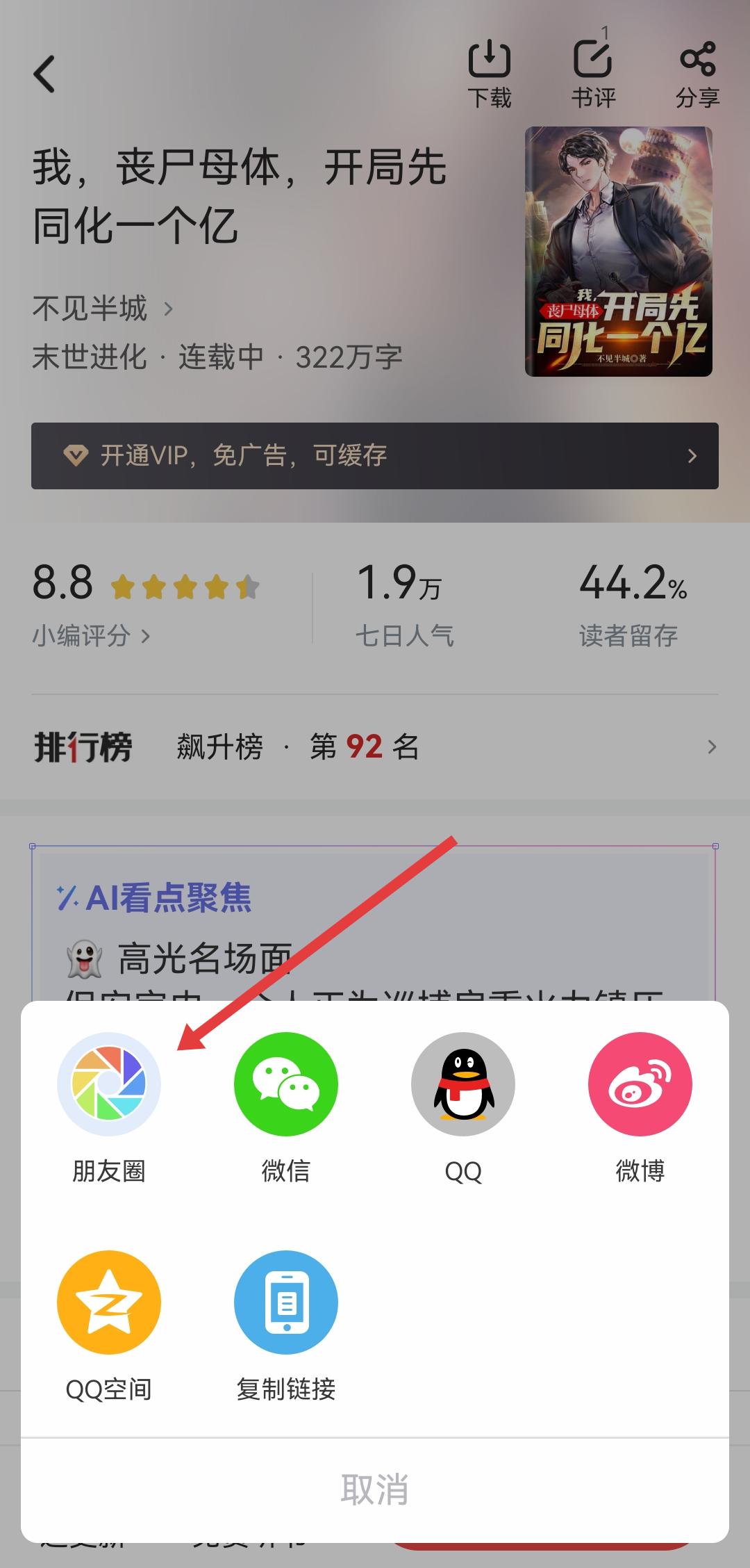 2、在书籍详情页面,点击右上角的分享图标,弹出分享选项列表。