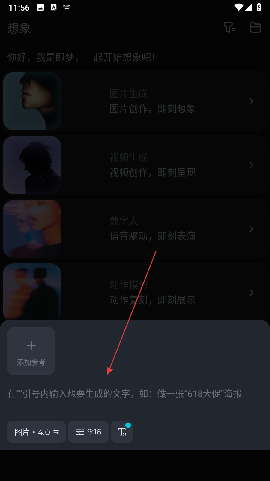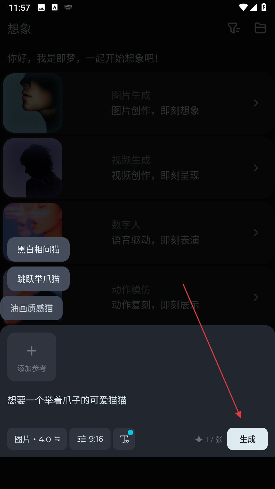 1、打开即梦AIAPP,进入想象页面,点击图片生成选项,进入图片生成界面。