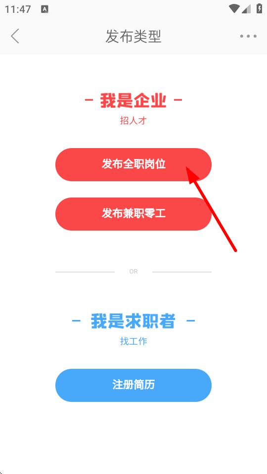 3、进入发布类型选择页面,选择我是企业-发布全职岗位。