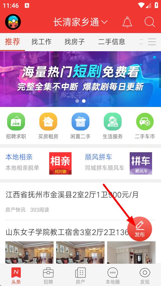 1、打开智慧乌苏app,在首页点击右下方的发布按钮。