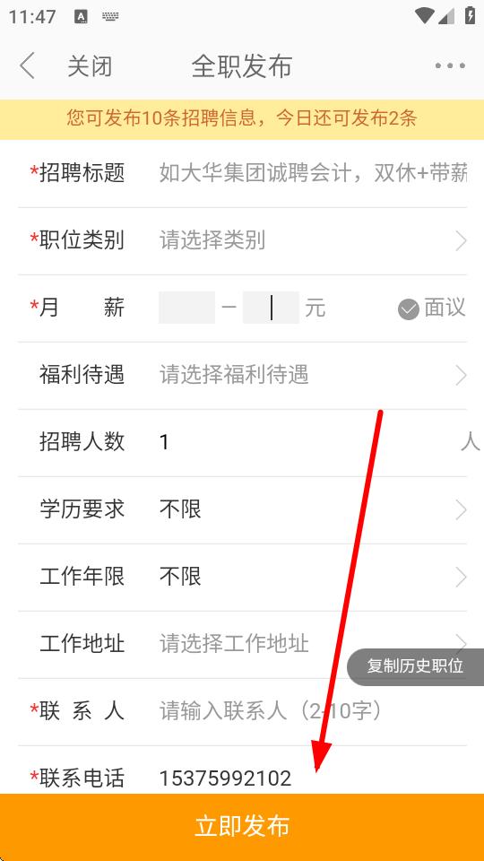 4、在全职发布页面,依次填写招聘信息,确认无误后点击立即发布,即可完成招聘信息发布。