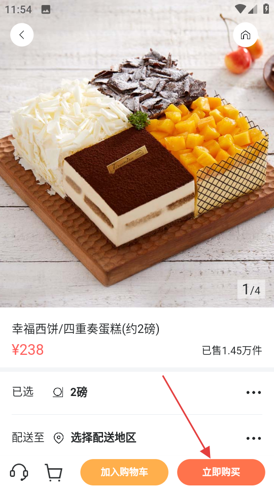3、在蛋糕详情页面,点击立即购买,进入配送地址选择页面。