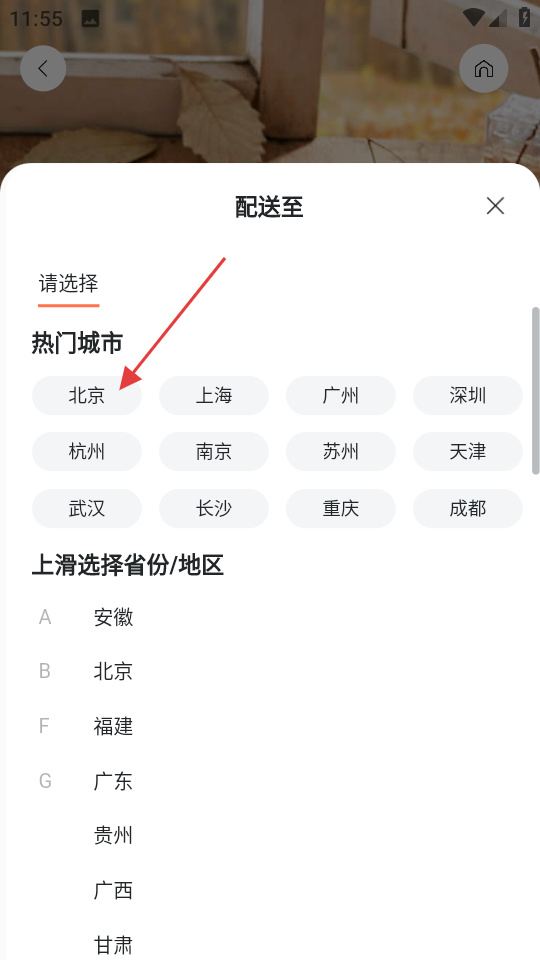4、在配送地址选择页面,选择北京作为配送城市,即可进行后续购买操作。