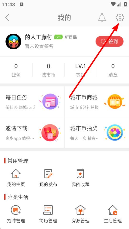 2、在我的页面右上角,点击设置图标齿轮形状,进入设置界面。