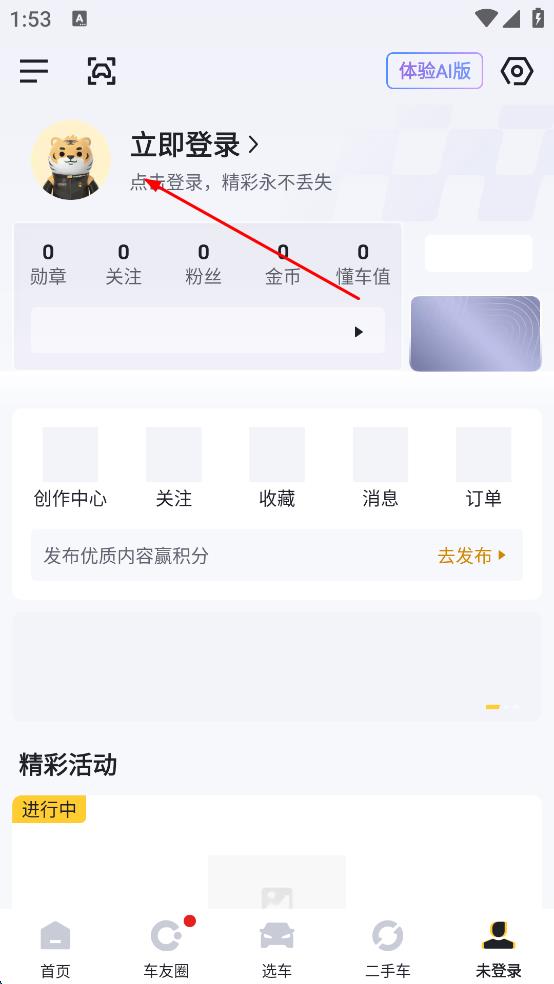 2、进入懂车帝APP主界面后,在界面底部导航栏中找到“未登录”选项并点击,界面会切换到个人相关页面。