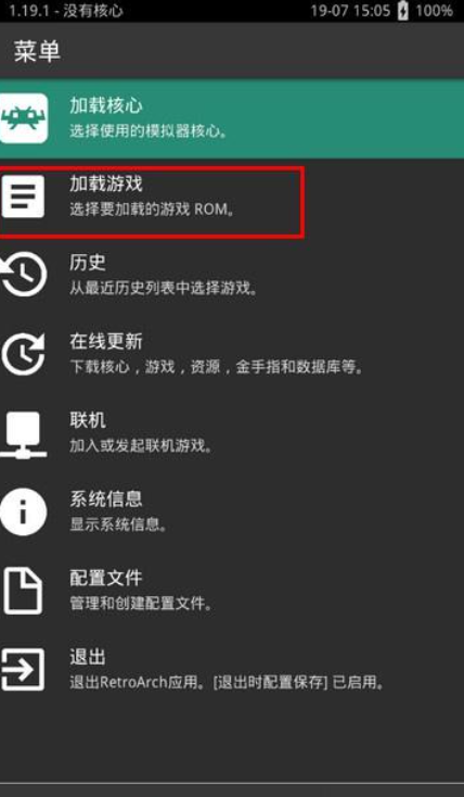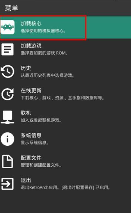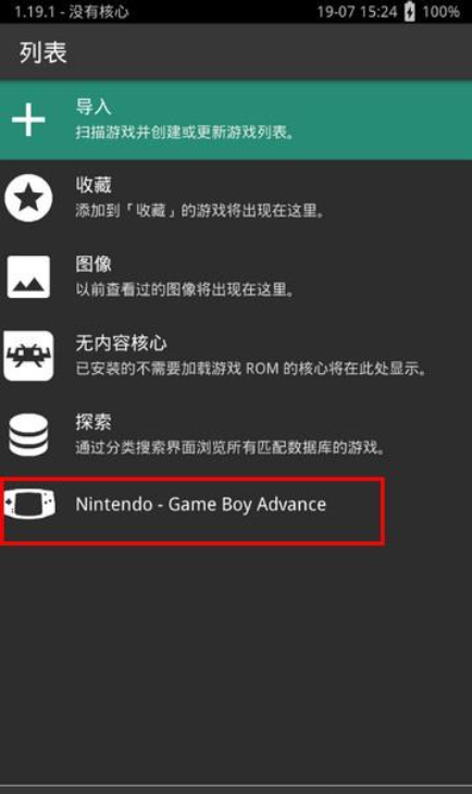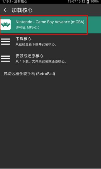 4、下载完后RetroArch会自动解压核心,我们返回游戏选择核心页面选择GBA核心。