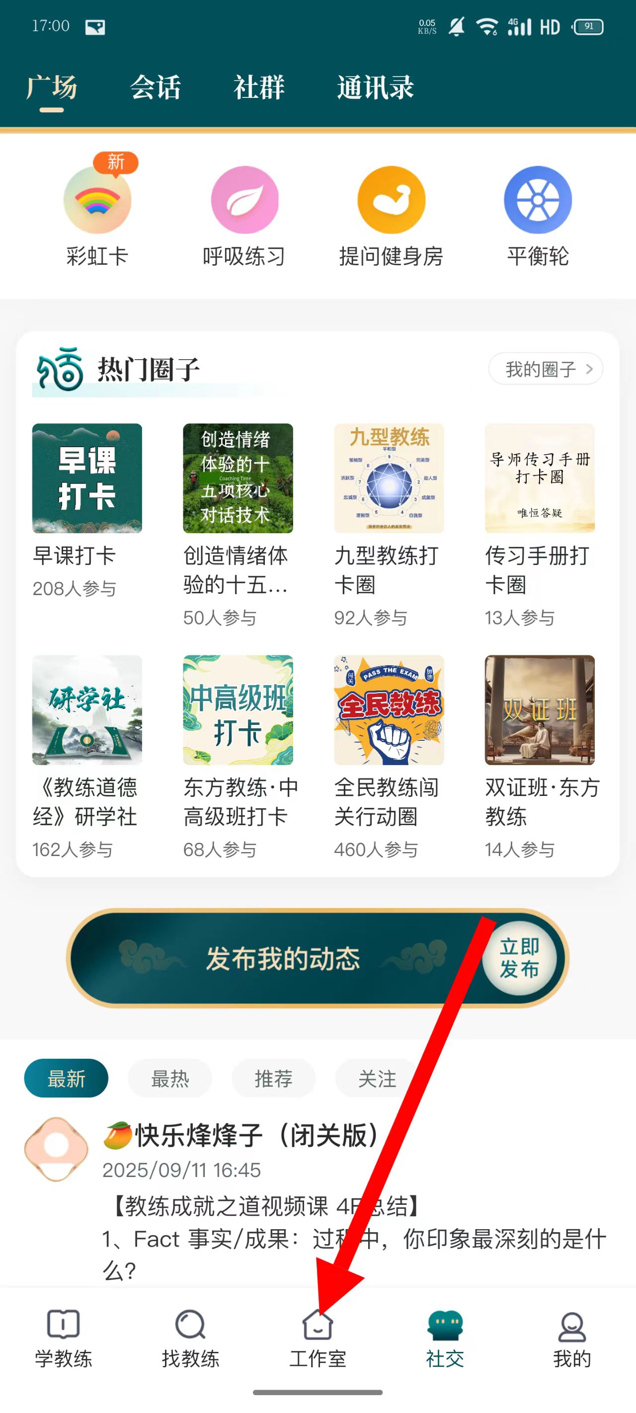 4、进入工作室页面,查看教练文化学习内容,以及活动日历等信息,开展教练文化学习与教练对话能力训练。