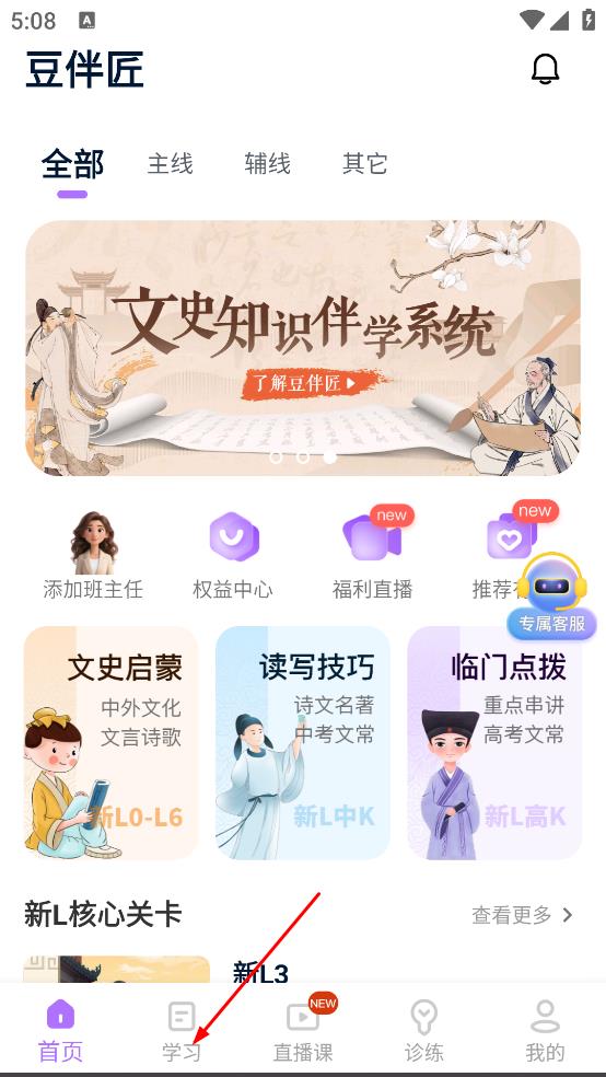 2、在豆伴匠主界面,点击学习,进入我的学习页面。