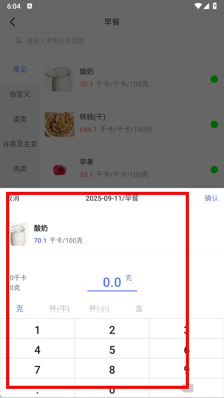 4、选择目标食物,并设置该食物的重量或食用量,完成后即可记录早餐的饮食信息。