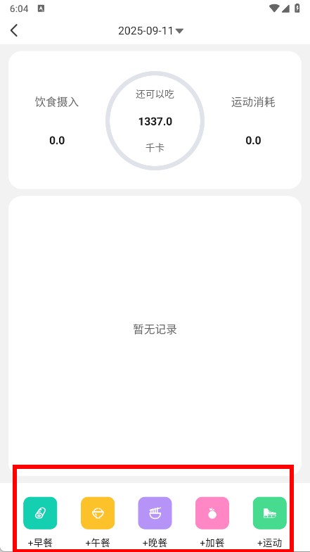 3、在饮食运动管理详情页面,点击底部的加早餐按钮,进入早餐食物选择与记录界面。