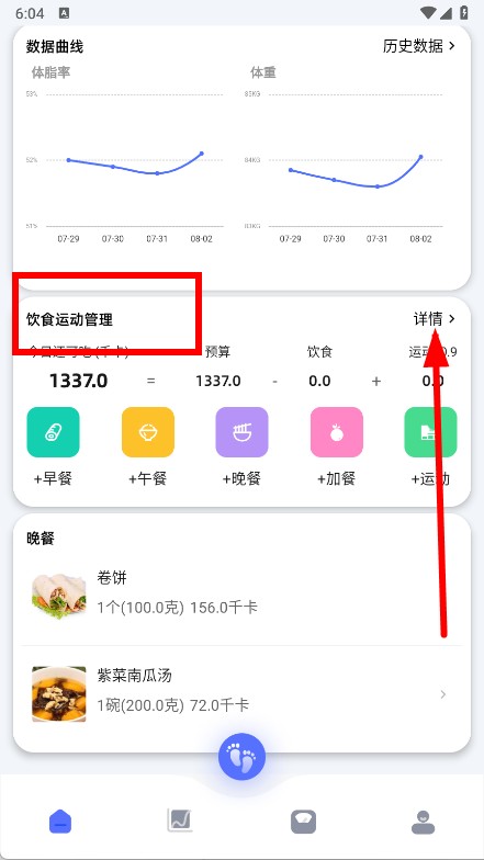2、在首页饮食运动管理板块,点击右侧的详情按钮,进入饮食运动管理详情页面。