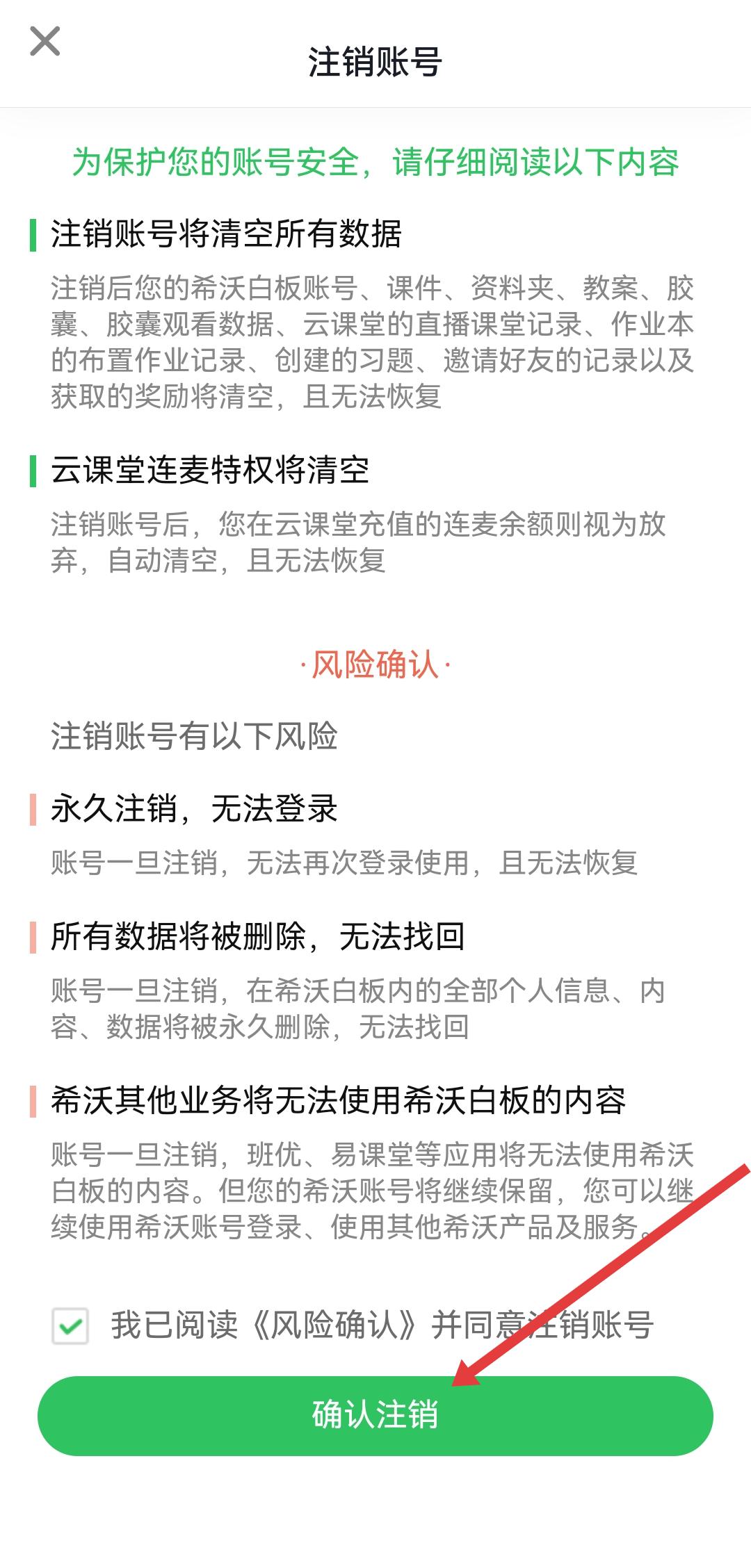 4、在注销账号页面,勾选风险确认,然后点击确认注销按钮,完成账号注销。
