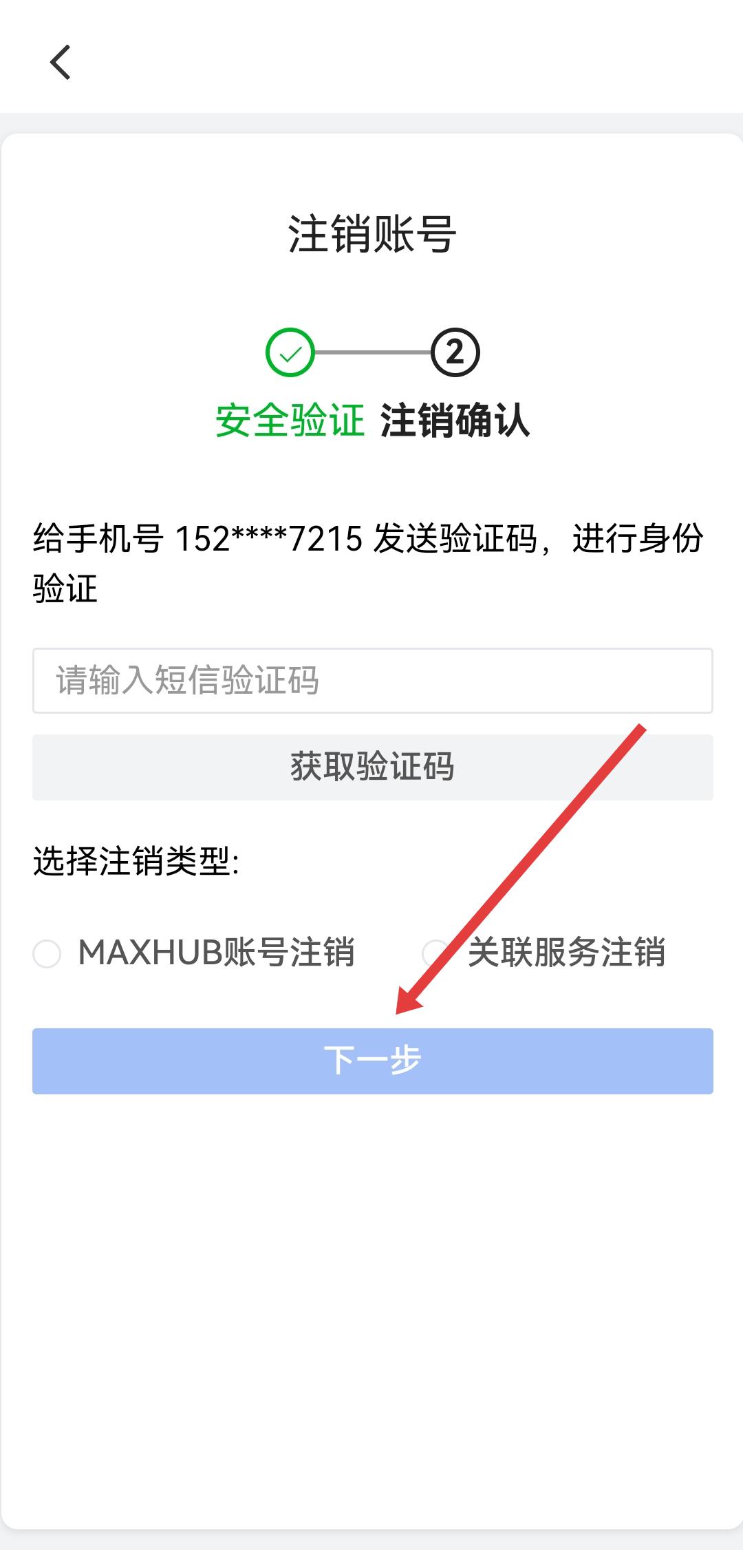 3、在注销账号的安全验证页面,获取并输入手机号验证码,选择注销类型后点击下一步。