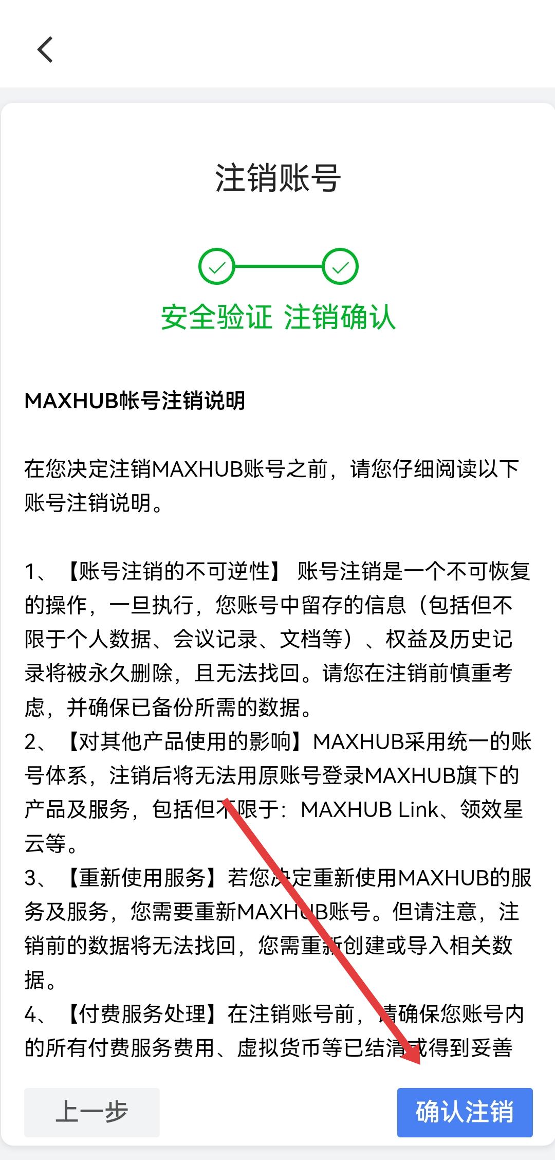 4、在注销确认页面,仔细阅读说明后,点击确认注销按钮,完成账号注销。