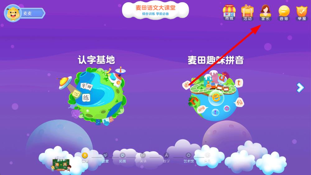 1、打开麦田拼音app,在主界面点击右上方的家长图标,进入家长相关操作页面。