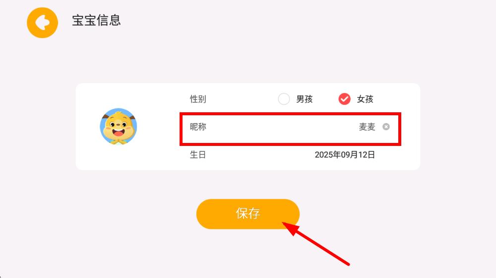 4、在宝宝信息页面,找到昵称栏,点击输入框修改名字,修改完成后点击保存按钮,即可完成名字更改。