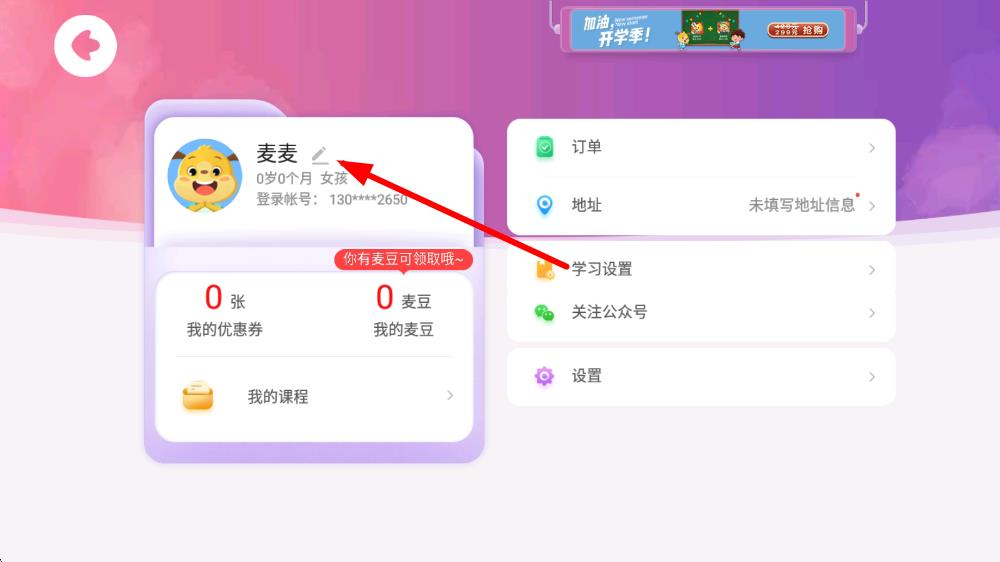 2、在家长页面中,点击头像旁名字处的编辑按钮,进入账号信息页面。