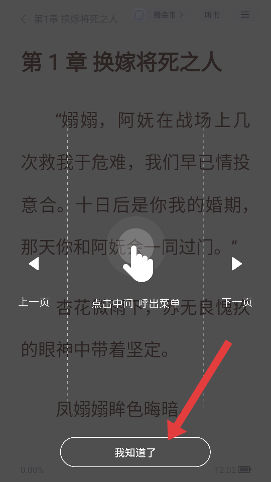 2、在小说阅读界面,点击我知道了按钮,关闭点击中间呼出菜单的提示。