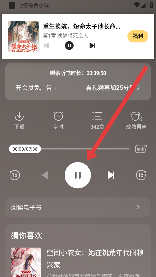4、进入听书界面后,点击中间的播放/暂停按钮,即可控制小说音频的播放,开始听书。