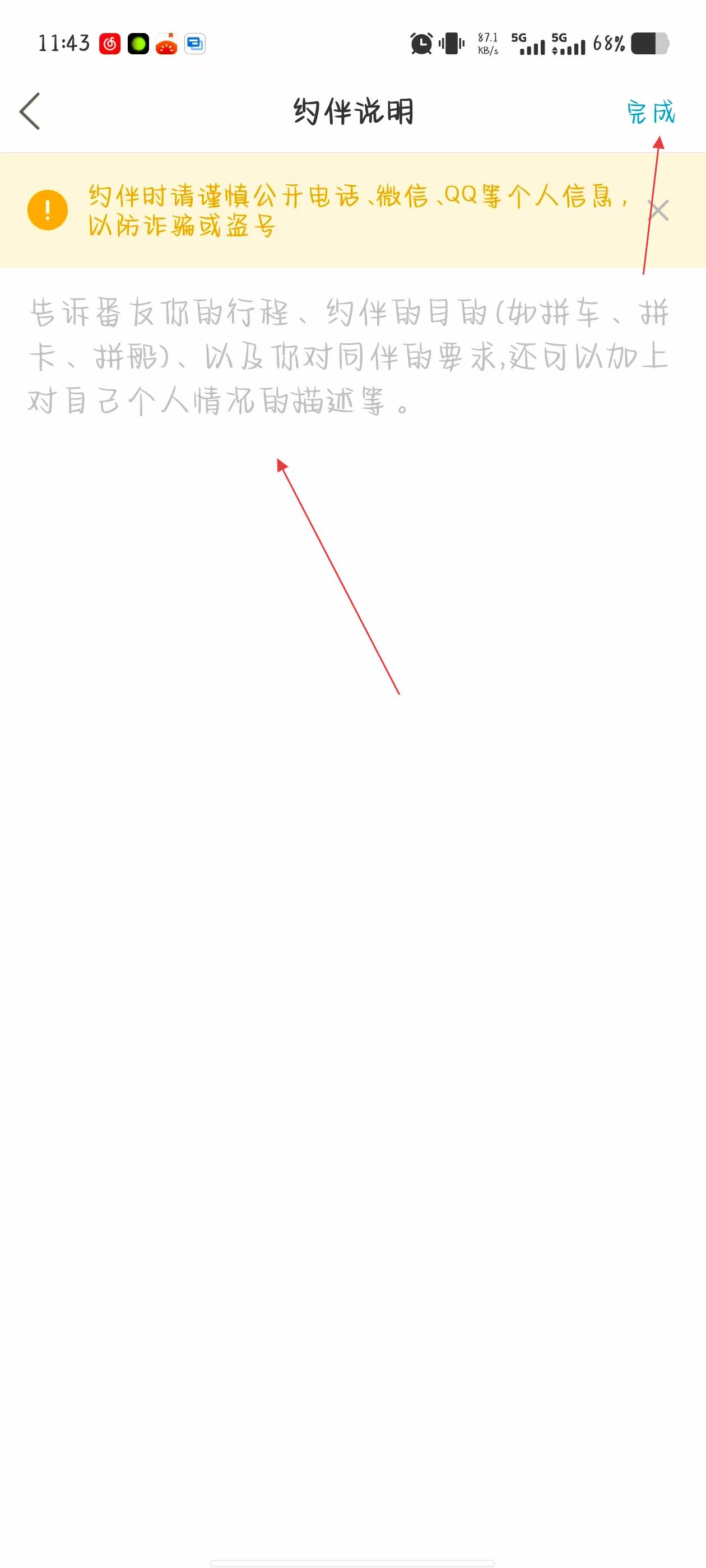 4、在约伴说明页面,输入行程、约伴目的及对同伴的要求等内容,点击右上角完成,之后返回点击发布即可。