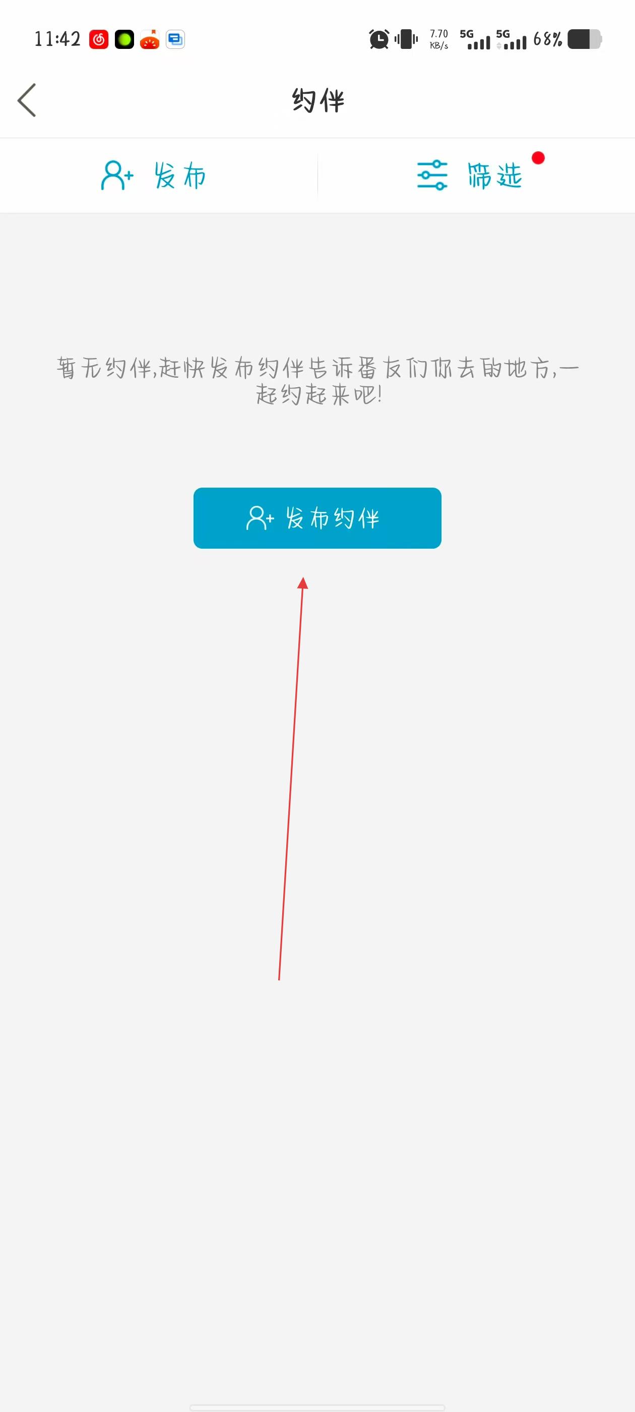 2、进入约伴页面后,点击蓝色的发布约伴按钮。