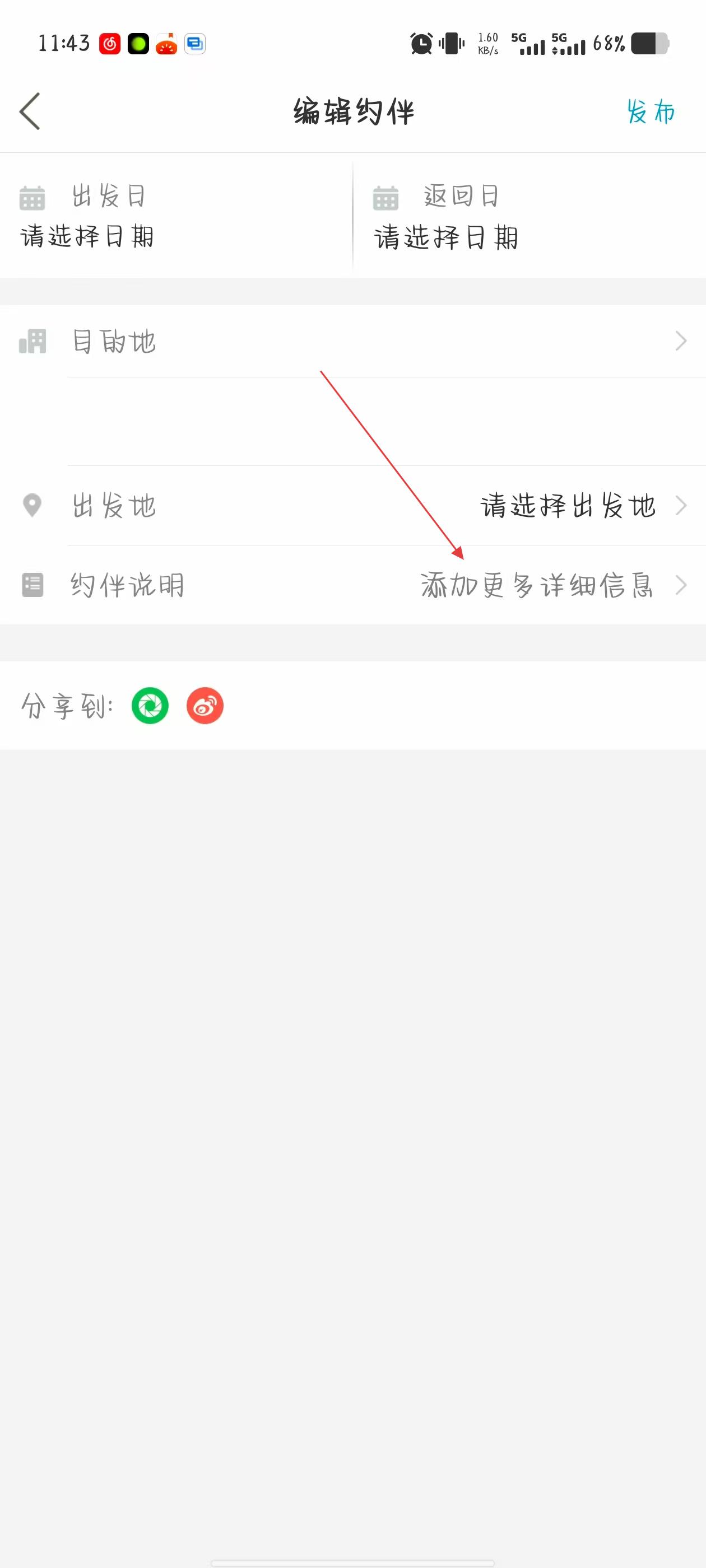 3、在编辑约伴页面,依次选择出发日、返回日、目的地、出发地,并点击约伴说明右侧的添加更多详细信息。