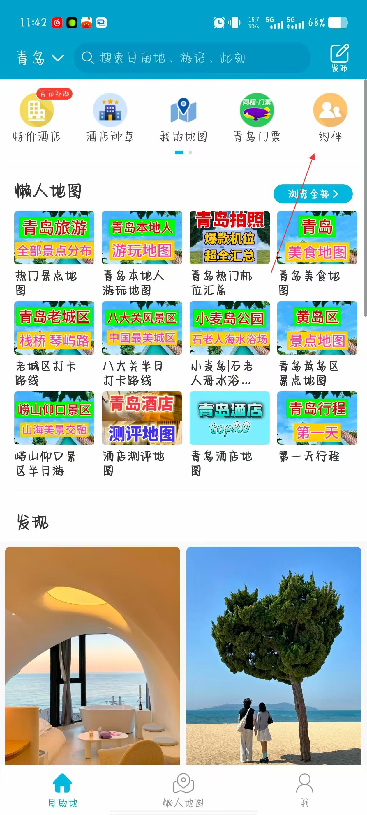 1、打开十六番旅行APP,在首页点击右上角约伴图标。