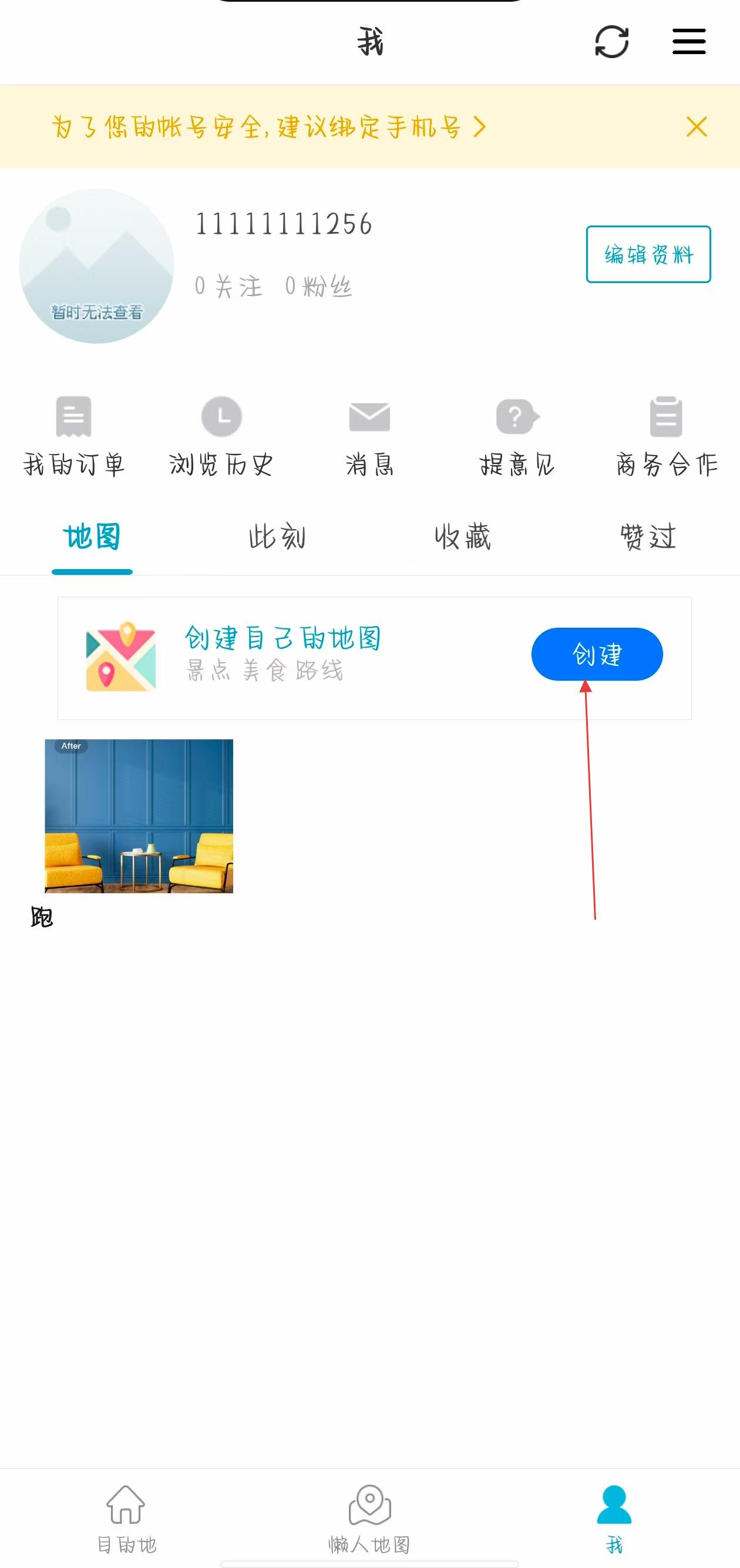 1、打开十六番旅行APP,进入我的页面,点击创建自己的地图右侧的蓝色创建按钮。