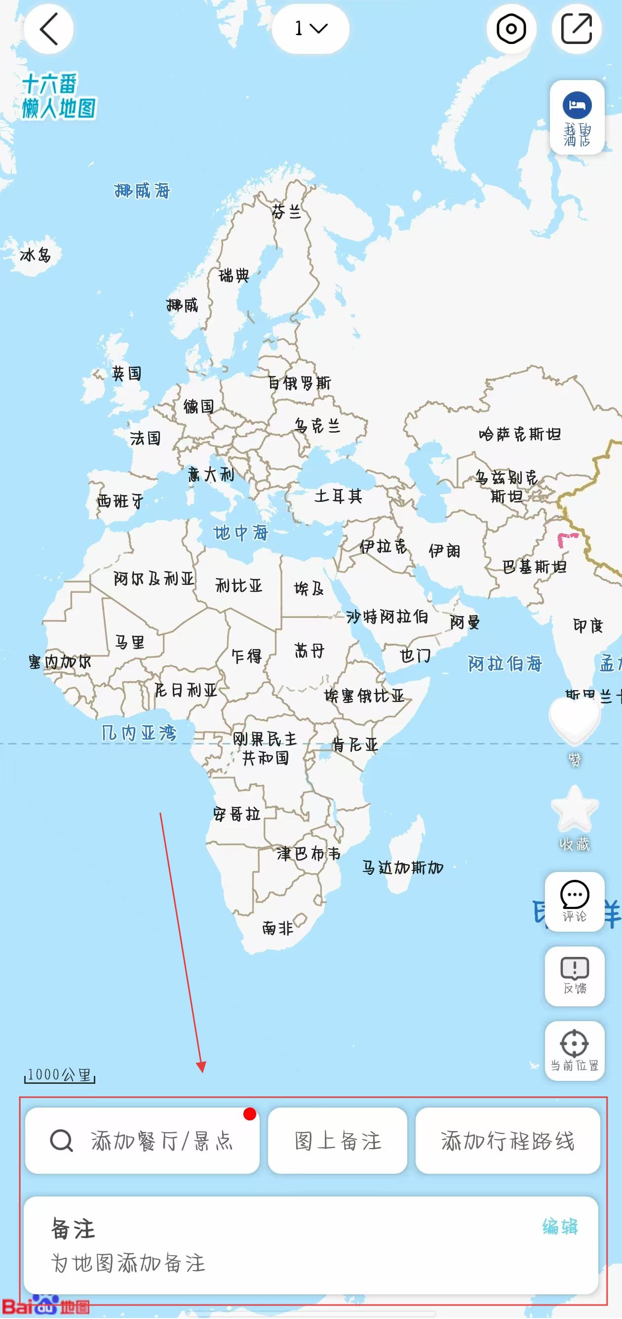 4、进入地图编辑界面后,通过添加餐厅,添加行程路线等功能,在地图上标记地点、规划路线,还可在备注栏添加文字说明。