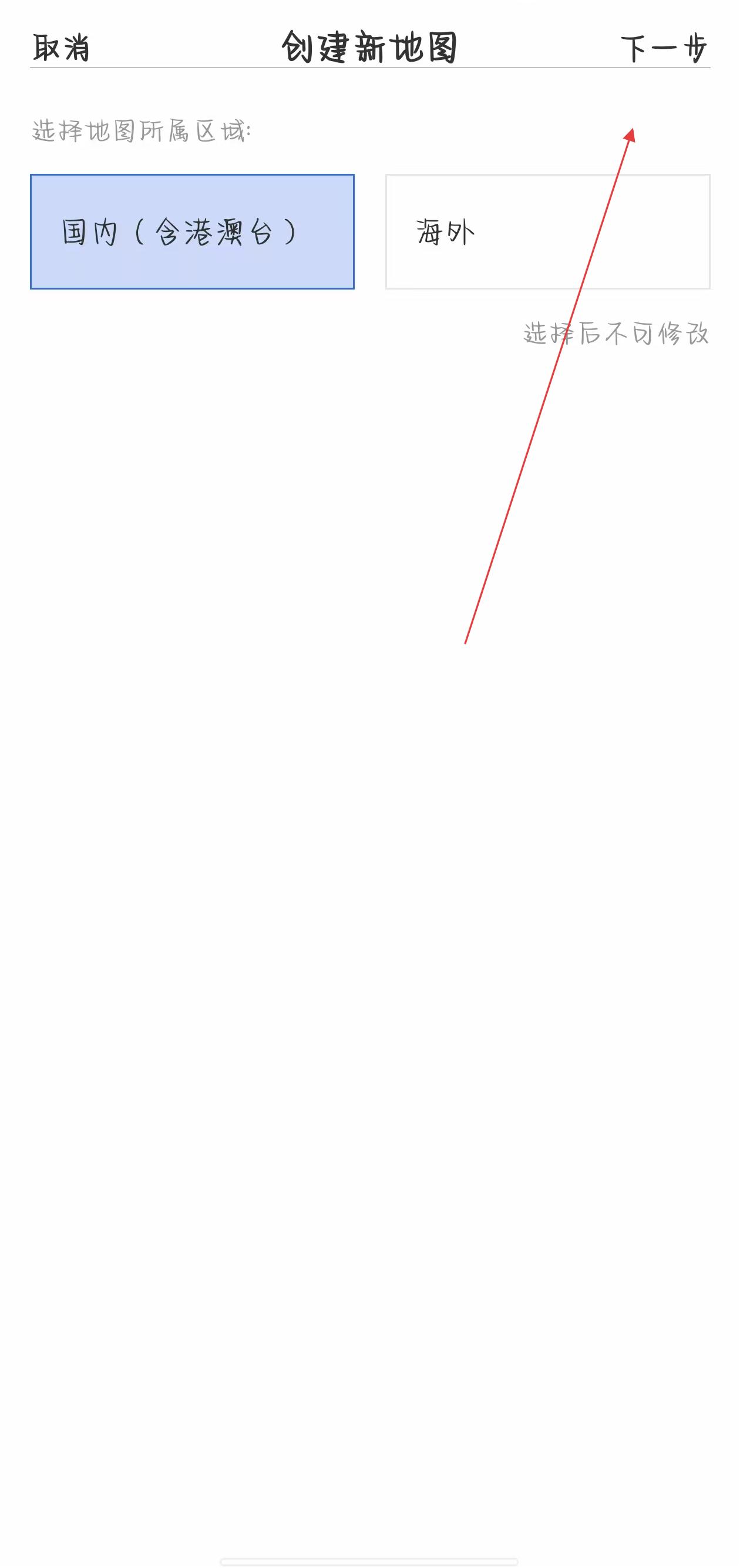 2、在创建新地图页面,选择地图所属区域,点击右上角下一步按钮。