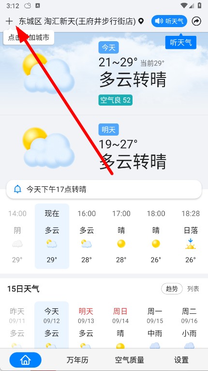 1、打开准点天气,点击页面左上角的+按钮,进入城市管理界面。