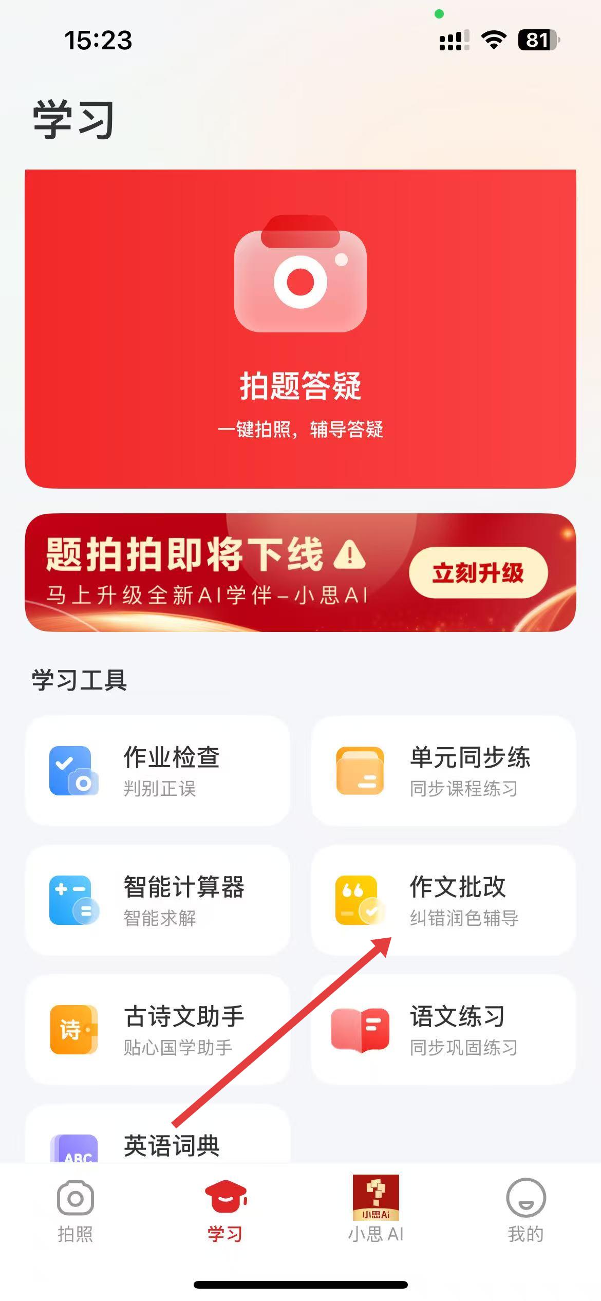 2、在学习工具列表里,点击作文批改选项,进入作文批改页面。