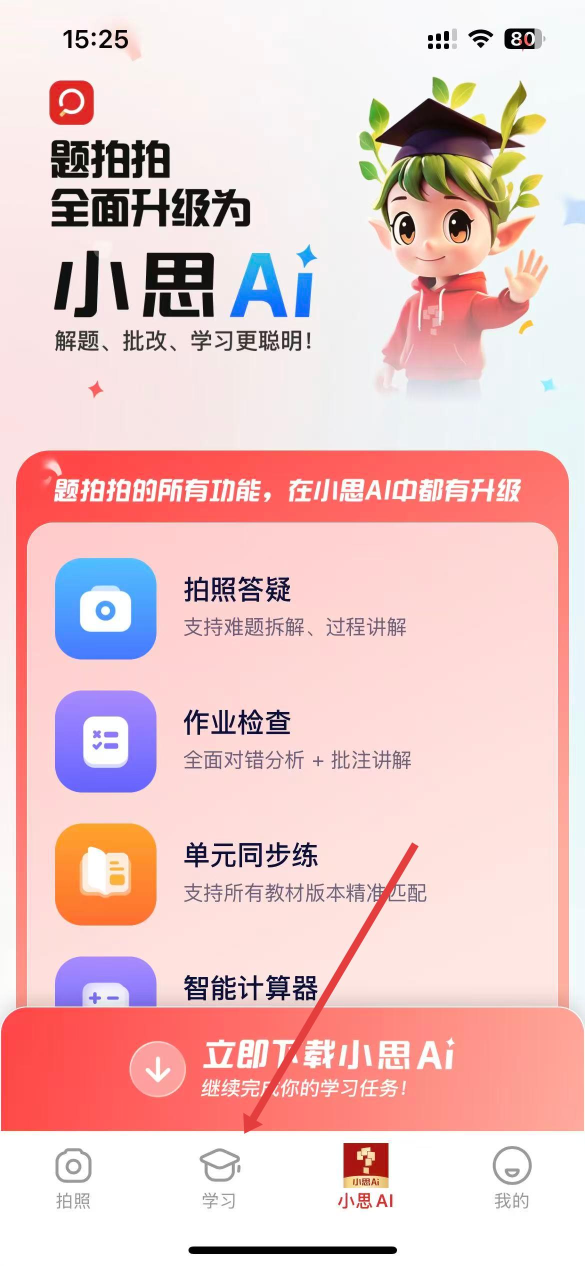 1、打开题拍拍app,点击底部导航栏中的学习选项,进入学习功能页面。