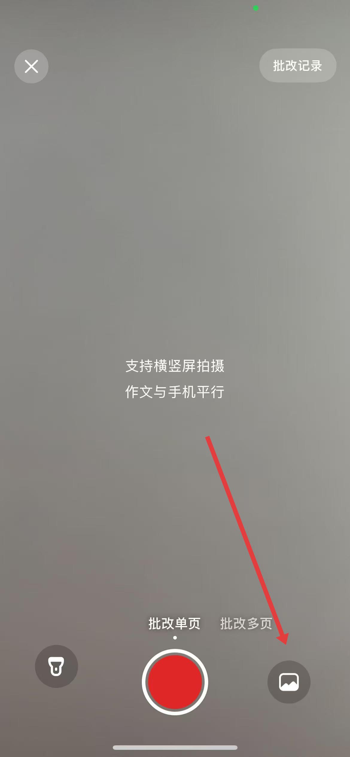 3、进入批改界面后,若要拍摄作业,点击下方红色拍摄按钮,若要上传已拍好的作业图片,点击拍摄按钮右侧的图片图标,选择手机相册中的作业图片。
