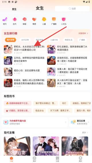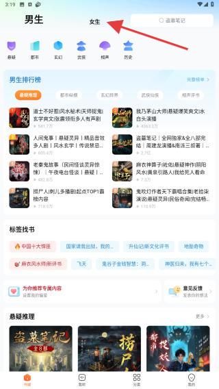1、打开酷狗听书APP,在首页内点击正上方女生的标签。
