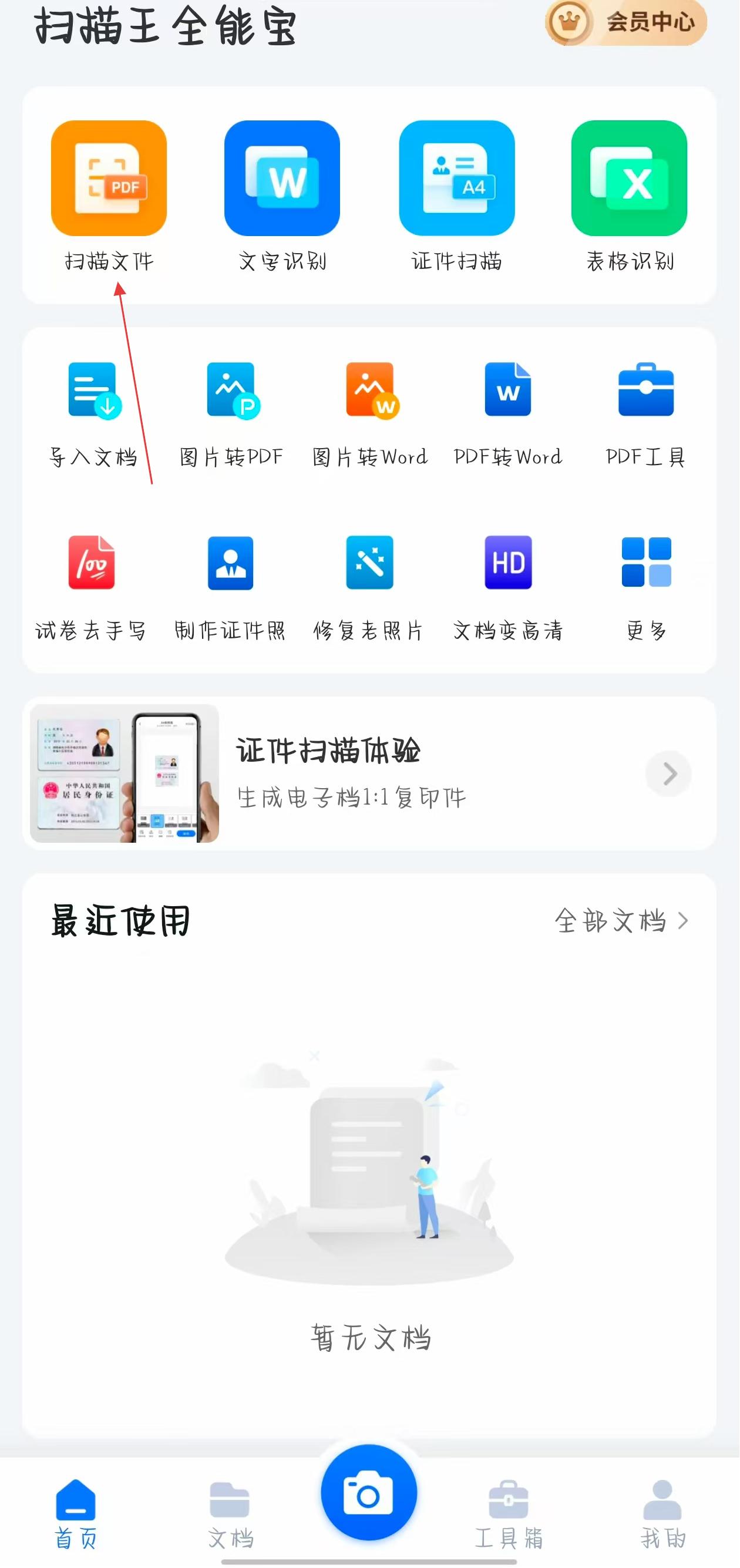 1、打开扫描全能宝APP,在首页点击扫描文件选项。